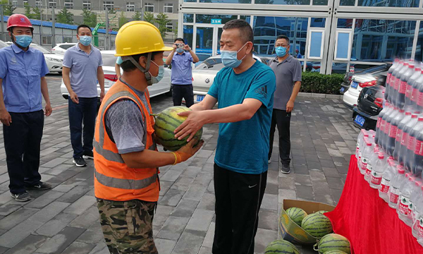 慰問中,李主任親切看望頂烈日、冒酷暑工作在建設一線的項目成員,為他們送去五十余箱飲料、飲用水和二百余斤西瓜等慰問品,詢問大家的工作及生活情況,詳細了解當前項目進展。