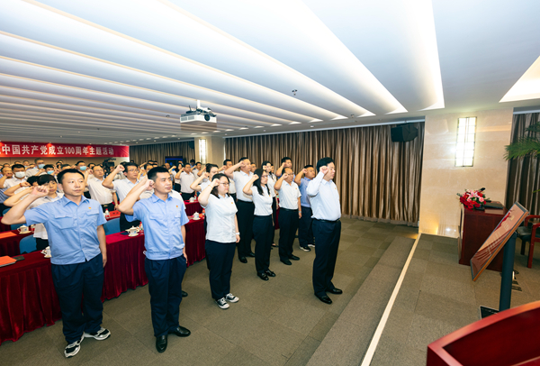 上午9時,伴隨著雄壯的《義勇軍進行曲》,活動拉開序幕。集團公司黨委書記、董事長陳先瑞帶領全體黨員,面對鮮紅的黨旗,重溫入黨誓詞,莊嚴宣誓,表達對黨的無比崇敬和無限忠誠。