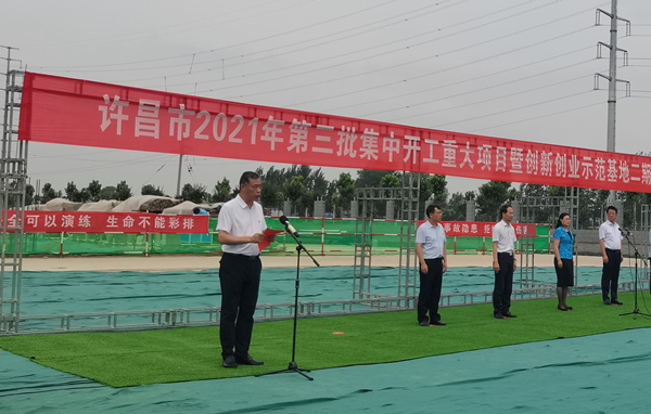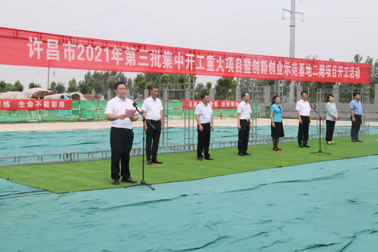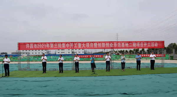 7月10日上午,河南省許昌市2021年第三批集中開工重大項目暨創新創業示范基地二期項目開工儀式順利舉行。許昌市委常委、紀委書記、監委主任方婷,魏都區委書記李朝鋒,區人大常委會主任申健民,區政協主席杜曉輝,區委常委、區委辦主任程中山,區委常委、區紀委書記、區監委主任徐光,魏都產業集聚區管委會主任楚文選,中航建設集團河南分公司總經理黃辰,魏都區政府相關部門、投資公司、產業集聚區、霸陵辦事處等單位負責人參加活動。區委常委、常務副區長張挪威主持儀式。