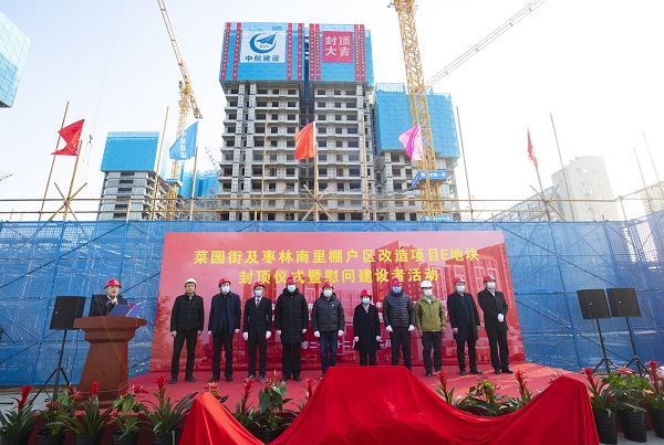 北京市西城區住房和城市建設委員會黨組成員、副主任朱洲,西城區白紙坊街道工作委員會副書記牛清河,項目建設單位北京廣安融盛投資有限公司董事長羅友發表致辭,對項目主體結構封頂表示祝賀,向各參建單位的辛勤努力和艱苦付出表示由衷感謝,希望各參建單位在后續的施工建設中精誠合作,共同打造精品標桿工程,為推進西城區棚改任務的全面勝利發揮積極作用,為當地群眾帶來幸福感和獲得感。